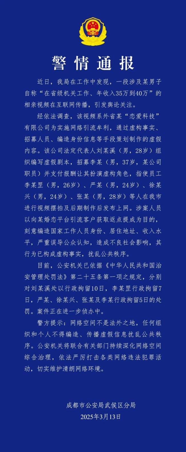 克日,成都会公安局武侯辨别局留神到一段对于某女子自称“在省级构造任务、年收入35万到40万”的相亲视频在收集上普遍传布,惹起了大众的存眷。经考察,这段视频是由外省一家名为“爱情科技”无限公司制造的虚伪内容。该公司经由过程虚拟现实、招募职员、假造身份信息等手腕谋划并制造了这段视频,目标是为了在收集平台上引流取利。